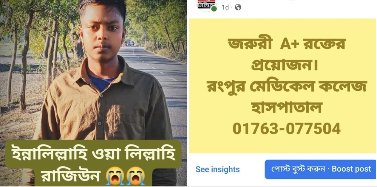 ​রক্তের জন্য আকুতি জানিয়েও শেষ রক্ষা হলো না। মাত্র এক ব্যাগ ‘এ পজিটিভ’ (A+) রক্তের অভাবে না ফেরার দেশে চলে গেল ১৪ বছর বয়সী কিশোর বাবুল। বৃহস্পতিবার সকালে রংপুর মেডিকেল কলেজ হাসপাতালে চিকিৎসাধীন অবস্থায় সে শেষ নিঃশ্বাস ত্যাগ করে।