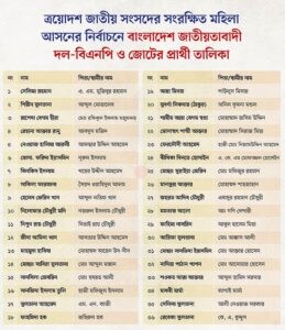 জাতীয় সংসদের সংরক্ষিত নারী আসনের জন্য মনোনীত প্রার্থীদের তালিকা প্রকাশ করেছে বাংলাদেশ জাতীয়তাবাদী দল (বিএনপি)। দলটির প্রেস উইং সূত্রে এ তথ্য জানা গেছে।